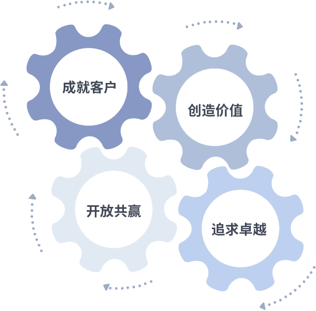 成就客户是一切决策的出发点,,,,创造价值是衡量所有工作的标准,,,追求卓越是美狮贵宾会做事做人的态度,,,,开放共赢是美狮贵宾会的格局也是最终的结果。。。。价值观的齿轮环环相扣,,推动着组织里的每个人不断向前。。